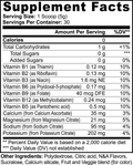 Ingredients: Vitamin B1 (Thiamin), Vitamin B2 (Riboflavin), Vitamin B3 (Niacin), Vitamin B6 (Pyridoxal 5 Phosphate), Vitamin B9 (Folate), Vitamin B12 (Methylcobalamin), Calcium (Calcium Citrate), Magnesium (Magnesium Citrate), Sodium (Sodium Citrate), Potassium (Potassium Citrate), Polydextrose, Citric Acid, Natural & Artificial Flavors, Sucralose, Calcium Silicate, Fruit & Vegetable Blend (for color)