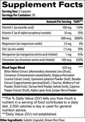 Ingredients: Vitamin C (as ascorbic acid); Vitamin E (as d-alpha tocopheryl acetate); Biotin; Magnesium (as magnesium oxide); Zinc (as zinc oxide); Manganese (as manganese amino acid chelate); Chromium (as chromium amino acid chelate); Bitter Melon Extract (Mormordica charantia Linn.)(fruit), Deglycyrrhizinated Licorice Extract (root), Cinnamon (Cinnamomum cassia)(bark), Gymnema Sylvestre Powder (leaf), Alpha Lipoic Acid, Banaba Extract (Lagerstroemia speciosa)(leaf)(std. to 1% corosolic acid), Yarrow Herb Powder, Juniper Berry, Mulberry Fruit Powder (fresh fruit), Taurine, Cayenne Pepper Extract (fruit)