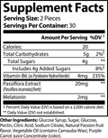Ingredients: Passiflora Extract (Passiflora incarnate)(herb), Vitamin B6 (as Pyridoxine Hydrochloride), Melatonin, Glucose Syrup, Sugar, Glucose, Pectin, Citric Acid, Sodium citrate, Natural Passion fruit flavor, Vegetable Oil (contains Carnauba Wax), Purple Carrot Juice Concentrate (Color).